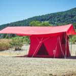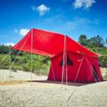 まず注目したいのが、伝統的なデザインを現代的にアップデートした「120th アニバーサリー テント&タープセット」です。シングルウォールのテントは、垂直に立ち上がるので室内は広々。三角窓がレトロな雰囲気をプラスしています。