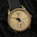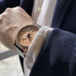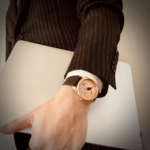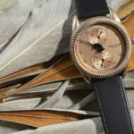 シャンパンゴールドとローズピンクゴールドの中間色でロープ模様のベゼルがついたケース、オイルレザーを使った本革ストラップも上質な雰囲気。それでいて、使いやすい国産クオーツムーブメントを採用したことで、手の届きやすい価格となっています。