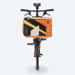 そしてベルクロストラップで取り外し可能なBROMPTON専用のアルミ製フロントキャリアフレーム付き。このフレームは、バッグに付けたままでも取り外しても、バックパックとして背負えます。