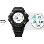 画面サイズは1.2インチで、時刻など常時表示に適したモノクロ液晶と、地図・計測情報などを高精細に表示するカラーTFT液晶を重ねた二層構造ディスプレイを採用。シンプルに時計として使いたい時、複数の情報を一度に手元で確認したい時など、シーンに応じてインターフェイスを選択できるのも便利です。