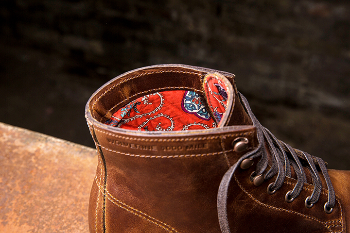 2016年春夏シーズンの限定モデルとして発表された新作は、ライニングにペイズリー柄のリバティファブリックを使用したもの。アメリカの老舗ブーツメーカーとイギリスの歴史あるテキスタイルメーカーの魅力を組み合わせ、グッドイヤーウエルト製法で作られたブーツは、重厚感と上質さのある仕上がりになっている。