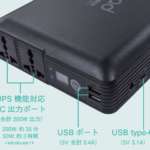 「enerpad UP-54K」は、本体にUPS機能を搭載、53,600mAhの大容量モバイルバッテリー。合計最大200W出力が可能なAC出力ポートを2口搭載し、それにUSB-AとUB-Cポートをそれぞれ1口ずつの合計4系統の出力を搭載します。