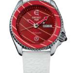 「SBSA105」は、なんと「寿司」をイメージしたデザイン。赤ベースに斜線が施されたダイヤルとベゼル、“シャリ”のテクスチャが再現されたホワイトのシリコンバンドの組み合わせは実においしそうです。裏蓋には、ピリッと辛いワサビカラーを配し、竜頭先端にはしょうゆを表現した黒色の石をセットするなど、随所にニクい演出も施されています。