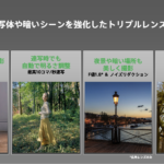 被写体やシーンを自動で判別して最適な設定が行われる「プレミアムおまかせオート」は、新たに「ペット認識」にも対応。犬や猫を認識するとシャッタースピードが速くなり、ISO感度が最適化されるとのこと。メインの広角カメラは、夜景などをキレイに撮れるノイズリダクション機能も備えています。