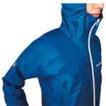 シリーズには、ジャケットとパンツの2タイプをラインナップ。ジャケットに搭載した顔回り・首回り・ひさしの3方向から調節可能な「トライアクスルフード」は、使わないときには衿裏に収納できる仕様。止水性が高いファスナーを採用し、袖口はベルクロで、裾はドローコードでフィット感を調節できます。