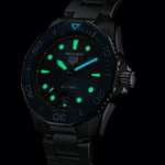 太い剣型の時針と細い分針は2004年に発表されたタグ・ホイヤー 2000シリーズを踏襲したもの。新コレクションでは、時針にグリーンのスーパールミノバを、分針にはブルーのスーパールミノバを塗り分けることで、暗所での視認性をこれまで以上に向上。このほか、インデックスとベゼルのセラミック製インサートに配された12時位置の三角形にもスーパールミノバを塗布しています。