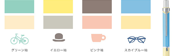 マニッシュラインは全4種。 軸色ごとに、マニッシュファッションを代表するアイコン(自転車・ハット・マグカップ・メガネ)が描かれている。この色使いなら、オフィスでも使えそう。こんな便利な文房具、学生だけに使わせちゃ、もったいない!