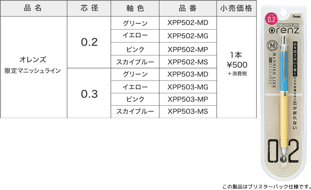 オレンズ限定マニッシュライン:芯径0.2、0.3mm各 540円