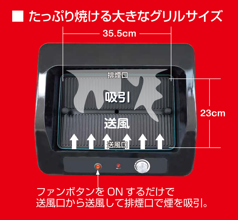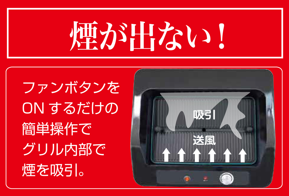 調理中に本体のファンボタンを押せば、送風口から風が送られ、出た煙を排煙口が吸引。排気口に搭載する消臭用活性炭フィルターが気になる脂のニオイもカット、室内に煙が残りにくいからリビングでの焼肉やバーベキューも安心して楽しめます。