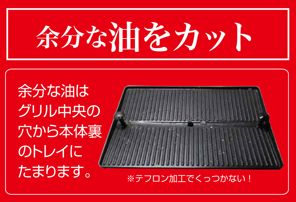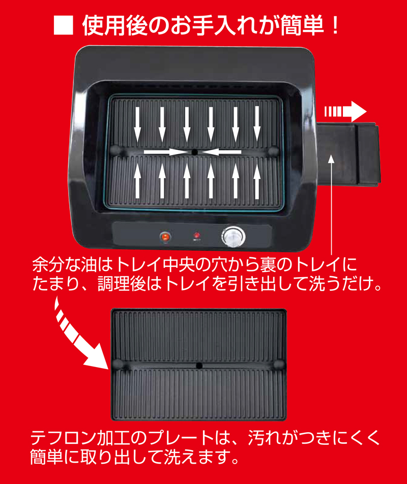 食材から出た脂の落ちるトレイも、本体から引き出して水洗いできるから、後片付けもカンタン! 価格は2万9800円。