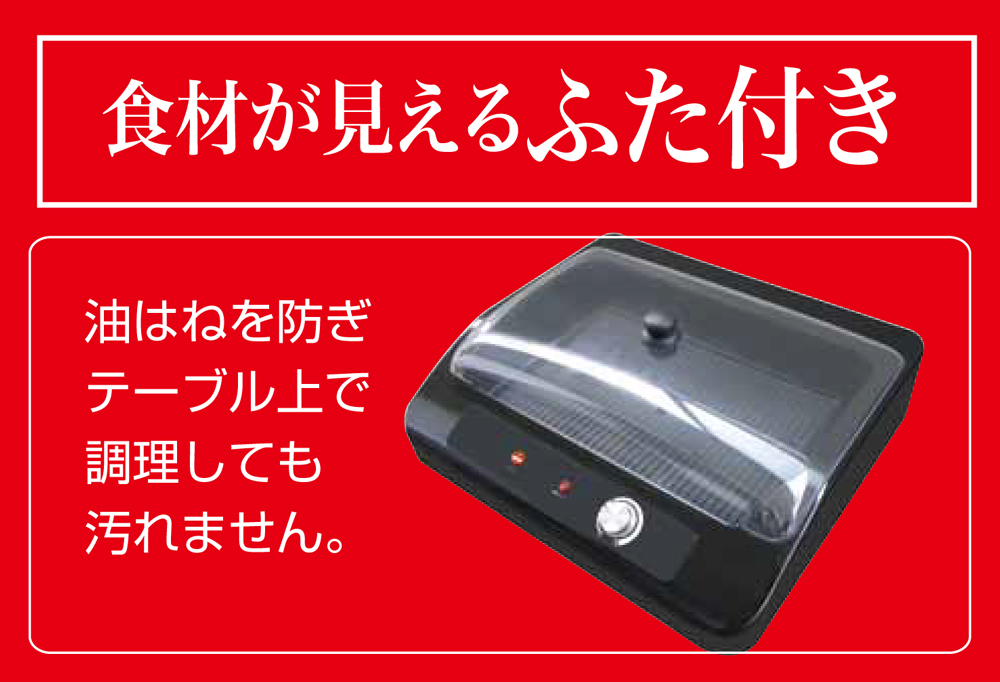 グリル面はたっぷり焼ける35.5×23cmの大判サイズで、家族やホームパーティにも余裕で対応。グリルプレートは汚れのつきにくいテフロン加工で、使用後は本体から外して丸洗いもOK。