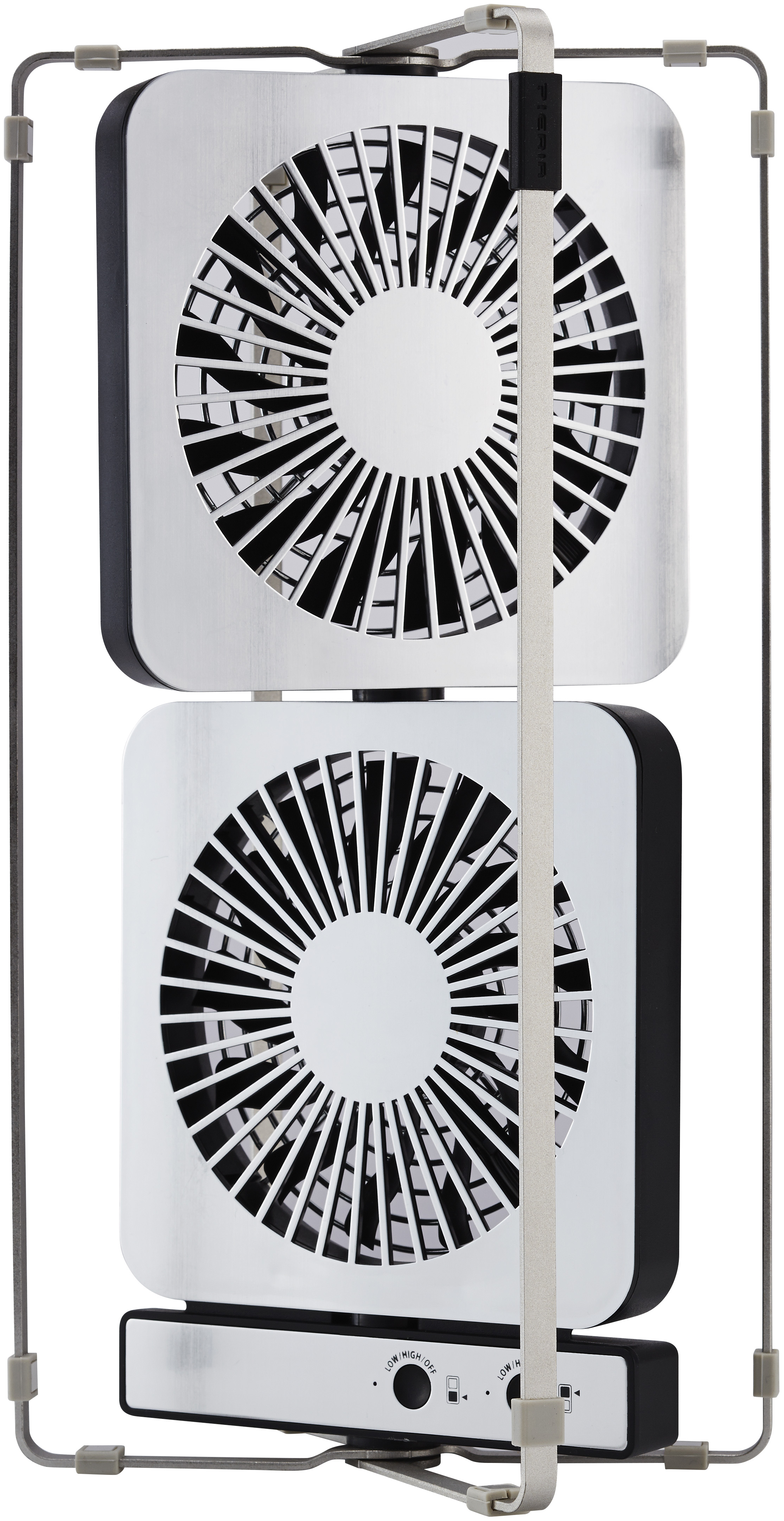 デスク周りで使えそうなのが「ツインデスクファン」。縦・横どちらでも置くことができ、2台が独立したスイッチを持つユニークな製品。スタンドをたためばペタンコになるから置き場に困らない。