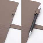 どのモデルにも名刺などのカードを収納できるカードポケットや、領収書やチケット、書類などを簡単に挟めるあおりポケットが付属。また、太い3色ボールペンから細い単色ボールペンまで、軸の太さに合わせて調整できる可動式ペンホルダーが付いています。