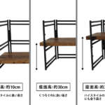 また、レッグの上下の向きを変えたり木材の置く位置を変えたりすることで、座面の高さを3段階で調整可能。一番低い座面高約10cmはあぐらスタイルに、座面高約30cmはローテーブルに、座面高約37cmはハイスタイルのテーブルにぴったりです。