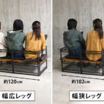 レッグ(フレーム)は2種類の幅があり、幅が広いレッグを背面にして長さ約130cmの木材を組み合わせれば3人がけのソファに、狭いレッグを背面して長さ約110cmの木材を組み合わせれば2人がけのソファになります。