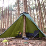 ひと言で言えばこの「トゥリーラブ」、木をそのままメインポール代わりに使用するワンポールテントです。木の幹にテント本体となる布地をぐるりと巻きつけて固定し、四隅をペグダウンするだけ。インナーテントもグランドシート無しという、テントというよりは“幕”に近い商品です。