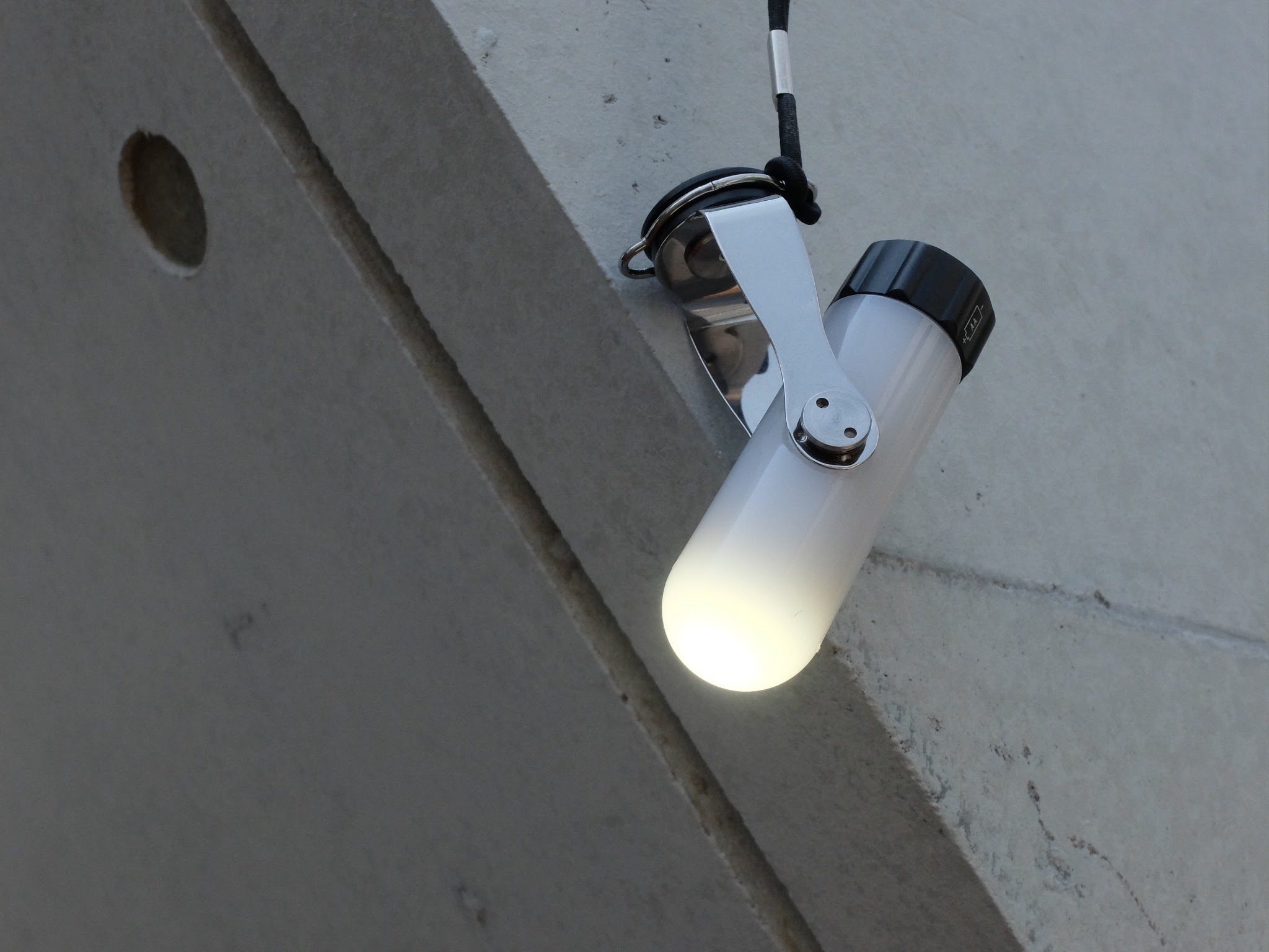 付属のストラップやカラビナを使って、ベルトからぶら下げて散策、テント内でぶら下げる、バックパックにぶら下げるなど使い勝手もいい。さらに台座は磁石付きなので、テントのパイプにくっつけたり、クルマのトラブル時にボディにくっつけたりとお役立ち。