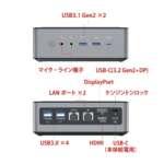 超小型ですがポート類も豊富で、USB3.0×4、USB 3.1 Gen2 (Type A) ×2、USB 3.2 Gen2+DP(Type C)×1に、Gigabit LANポート×2。ケンジントンロックも搭載され、小型モデルだとちょっと心配になる盗難も抑止。無線ではもちろんWi-Fi、Bluetoothともに対応。
