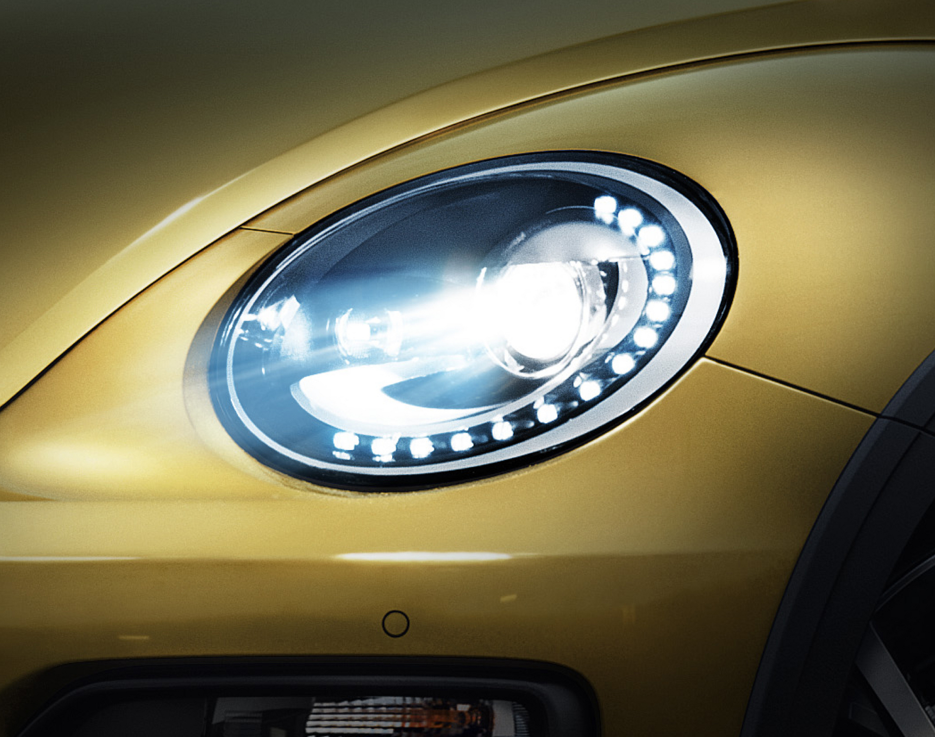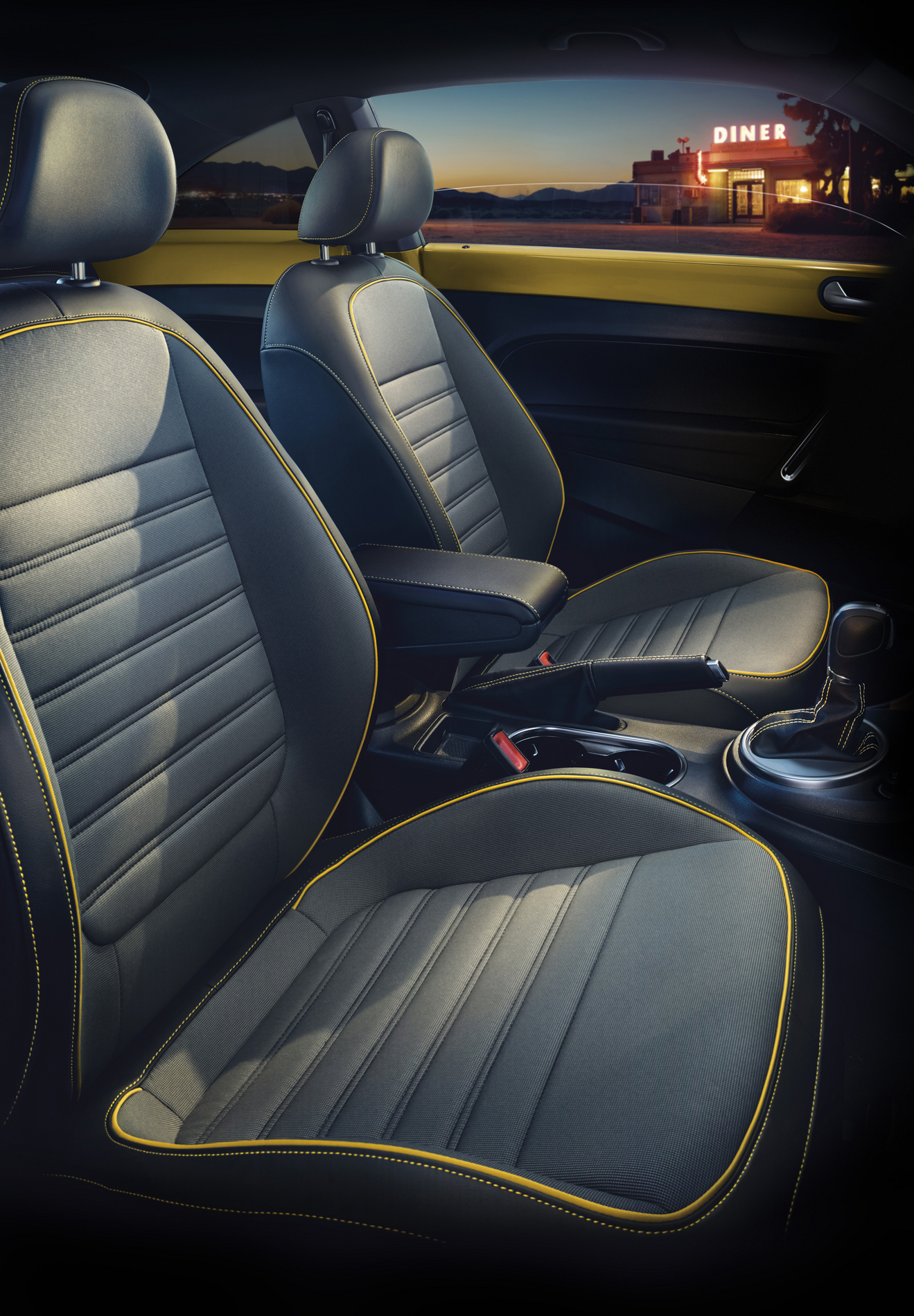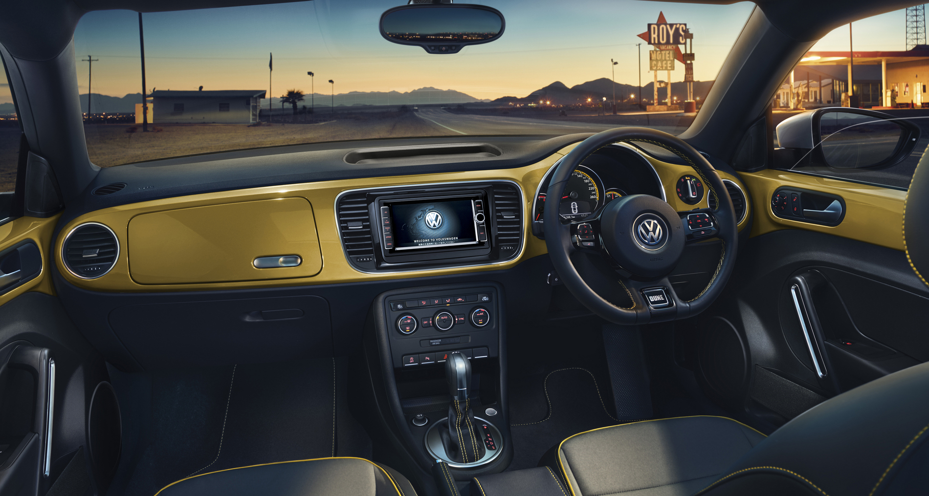 これに、サンドストームイエローメタリックのボディカラーを組み合わせたことで、ビートルらしい鮮やかな印象を強めています。インテリアでも、ダッシュボードのデコレーションパネルなどに、このイエローメタリックのカラーをあしらっていますから、ドライバーズシートからの印象も鮮烈です。