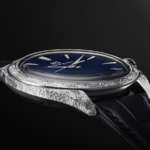 静かな輝きを湛えたダイヤルを包んでいるのは、星雲のような放射状の装飾を施した華麗なプラチナケース。立体的にデザインされた時分針とインデックスには14Kホワイトゴールドを採用し、全体の印象を凛としたものにまとめています。