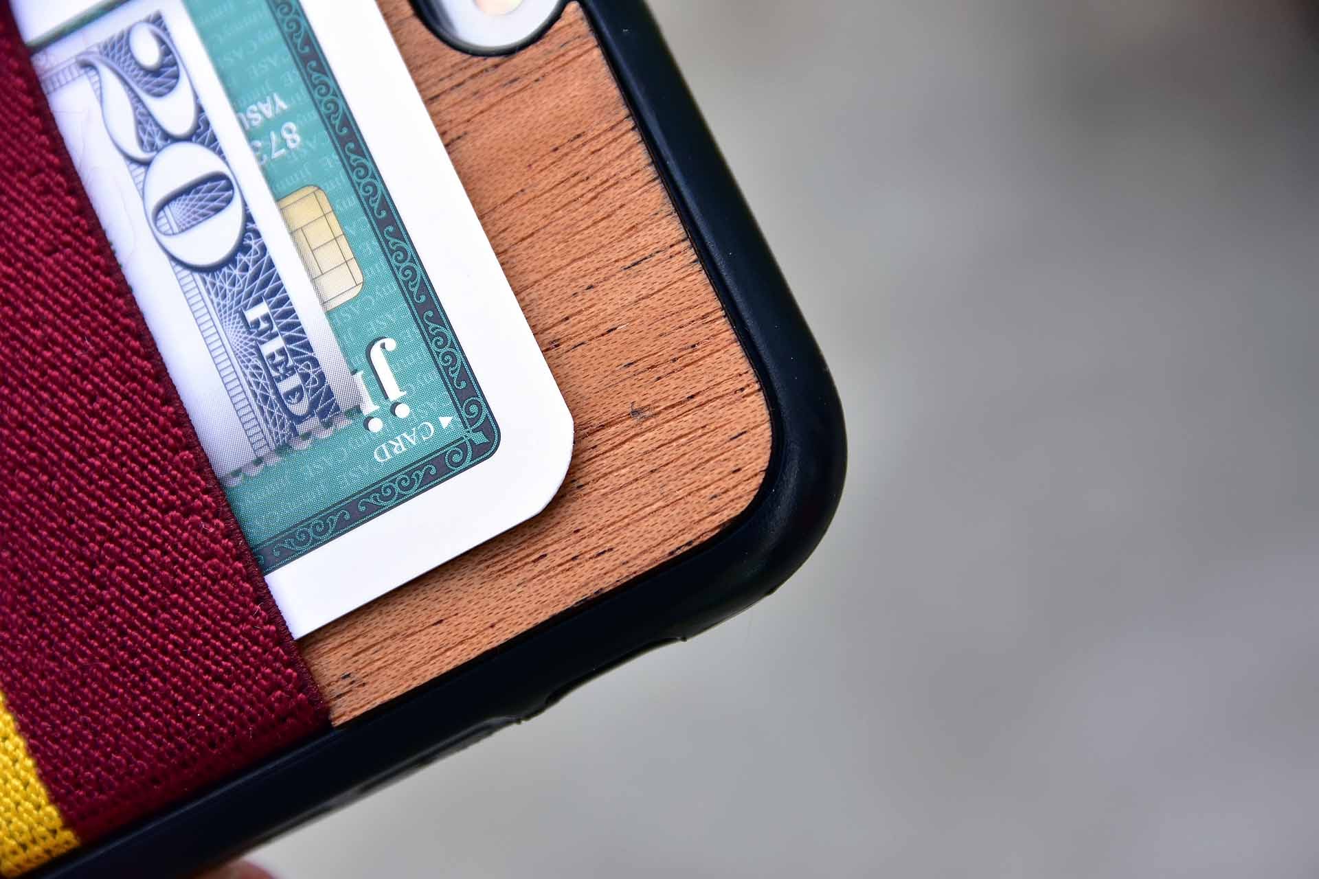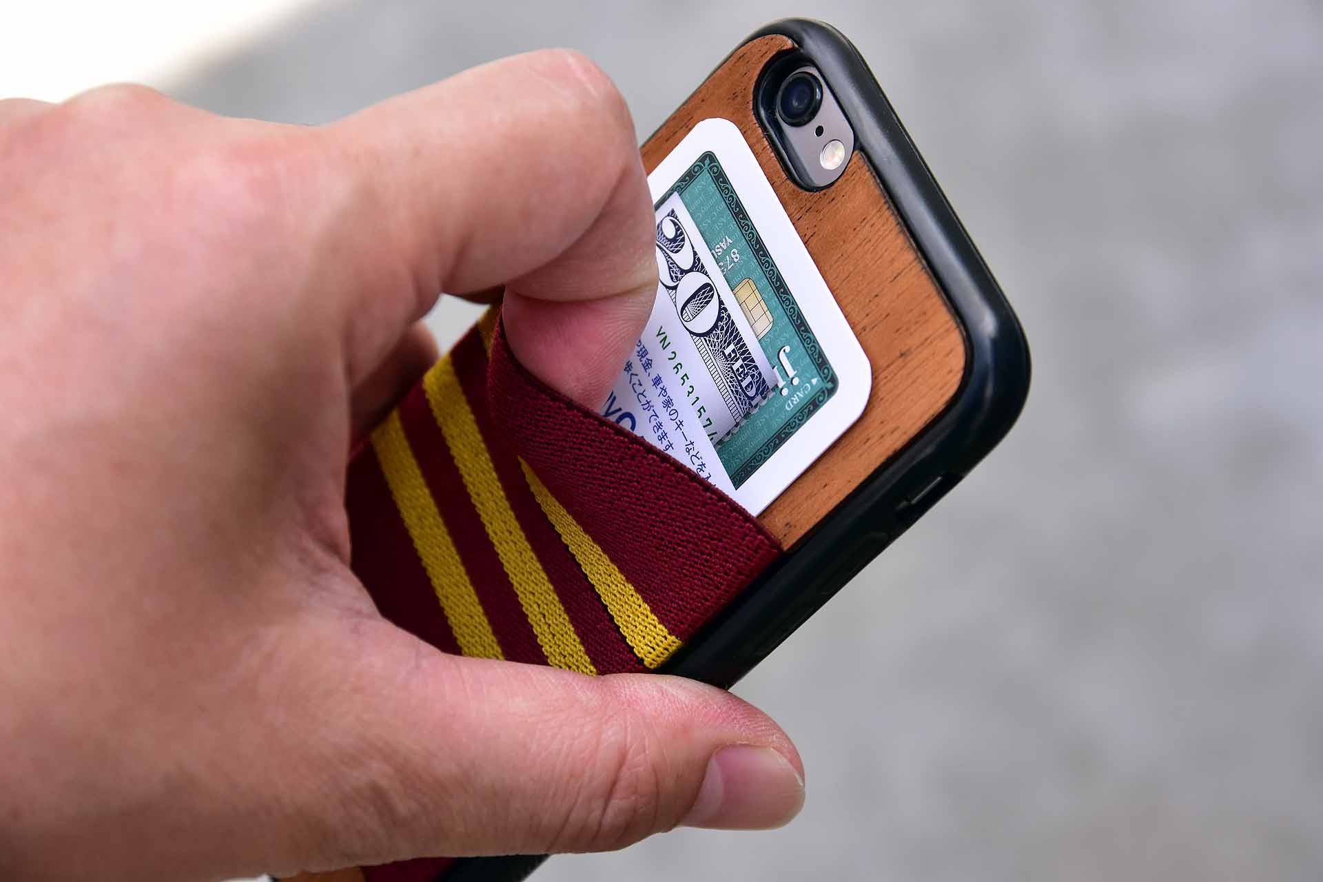 裏面にストレッチ素材のバンドを配し、ここに紙幣やカードを収納することができる。最大6枚のクレジットカードを収納し、たとえ1枚でも落ちることがない。また、車や家のキーなどもしっかりホールド。ICカードを挟んでおけば電車・バスでも使える。