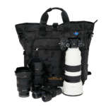大きめのズームレンズの運搬に特化した “Sanctuary(サンクチュアリ)”シリーズの新製品「Sanctuary III RT140 ブラックカモフラージュ」。容量は約12リットル、内寸の幅は320~330mm、奥行きは130mmほど。100-400mmの望遠レンズを装着したミラーレスカメラもそのまますっぽりと入れて、気軽に運搬できます。