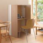 「オレルタ」は、見た目はシンプルなキャビネットのようなスタイル。使用時に扉を開いてデスクをセットすれば、両サイドで周囲の視界を遮り、仕事に集中できるスペースを作り出します。使わないときは、扉を閉じるだけでコンパクトに収まり、スペースを邪魔しません。これならオン・オフの切り換えも簡単にできますね。