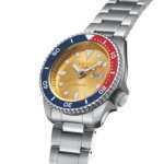 その特徴は、レギュラーモデルにはない新鮮なカラーリング。ゴールド調に輝くダイヤルには、シンプルなホワイトのインデックスを配し、3時位置にはデイデイト表示を配置。針とインデックスにはルミブライトを施し、暗所での視認性も確保しています。