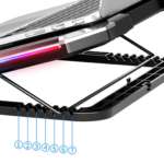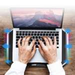 また、クーラー本体を7段階の角度で傾けることができるのも注目ポイント。首や肩に負担を掛ける猫背を防ぎ、正しい姿勢でノートPCに向き合えるようになります。本体手前側にストッパーを備えており、角度を付けても本体からノートPCがずり落ちることはありません。