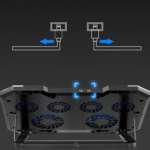 手前側に大サイズ2基、奥側に小サイズ4基の冷却ファンを内蔵し、ノートPCのCPUやHDD、グラフィックボードなど、発熱する位置に合わせた配列で効率よく冷やします。ファンの風量は6段階で、ノートPCの温度状況に応じた調整が可能。液晶画面で風量を随時確認できます。