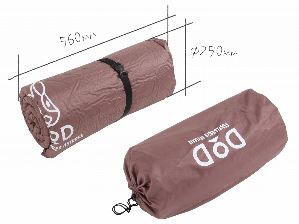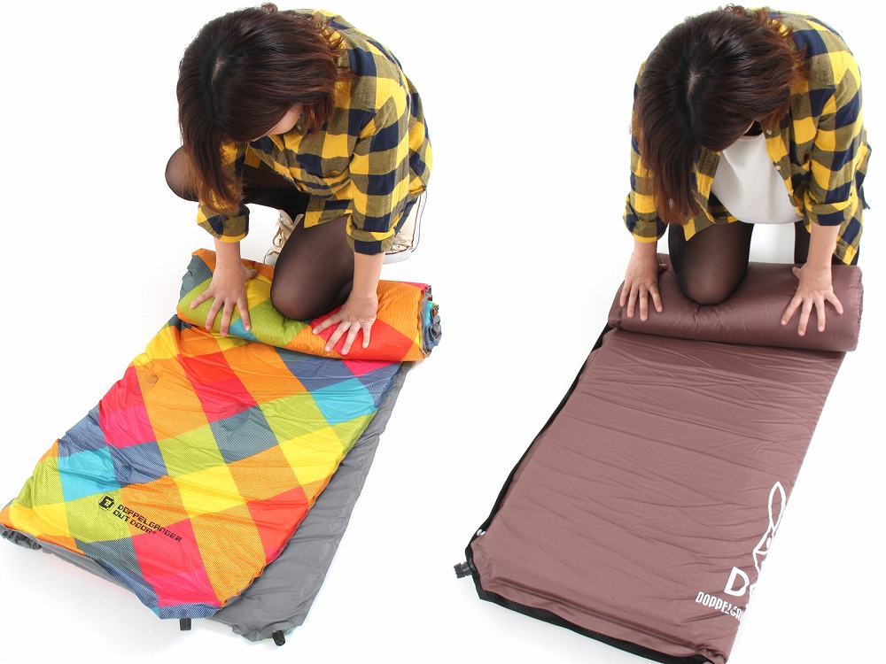 端に付いているボタンは、収納時にも役立ちます。マットを縦長にふたつ折りにして丸めると収納袋にちょうどいいサイズになるんですが、いざ丸めるとなると、どうしてもずれてしまう。シュラフのように、エアマットの特性上、シュラフのように袋にぎゅうぎゅう押しこむわけにもいきません。しかし、端と端のボタンを留めれば、ずれることもない。ぎゅうぎゅう空気を抜きながら巻いても、きれいにバッグに収まるように巻けちゃいます。
