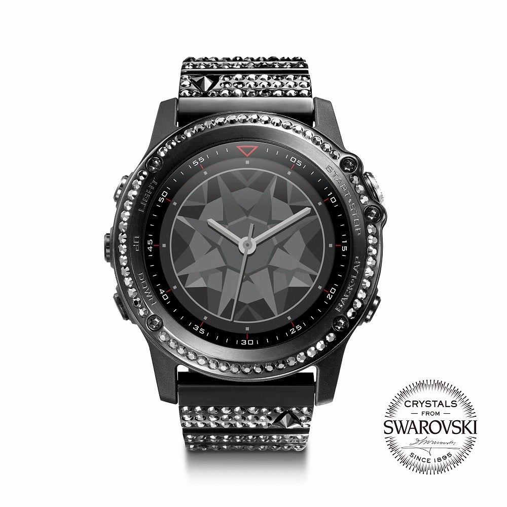 「fenix 3J Sapphire Crystal(フェニックススリージェイ クリスタル)」は、オーストリアのクリスタルガラスブランド、スワロフスキー社とコラボしたアイテム。マルチスポーツ対応のGPSウォッチでありながら、パーティーにも着けていけるくらいのゴージャスさ。クロコダイル調のブラックレザーバンドも付属しているので、TPOにあわせて使えるスグレモノです。