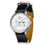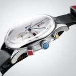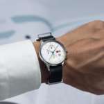 「DF-9021-0F」のベースモデルは、「ファン・デル・ローエ・バルセロナ・クロノ」の爽やかなホワイトダイヤルモデル。12時・6時・9時位置に3つのインダイヤルが配置されていて、上下2つのインダイヤルは緩やかな窪みで形成されているのが印象的です。