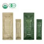 丸ごと摂取するからこそ、専用茶葉にもこだわりが。抹茶リーフは日本で数少ない農薬・化学肥料を使わないオーガニックの有機碾茶(てんちゃ)を採用。現在は、一番茶と二番茶をブレンドした「SIGNATURE(シグナチャブレンド)」と100%一番茶の「PREMIUM(プレミアムブレンド)」の2種類をラインナップしており、20gの包み1本で最大20杯の抹茶を作ることができます。