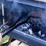 薪をならす時には、クチバシのような突起を少し開いたまま使用。いい感じになった熾火も平らにならせます。