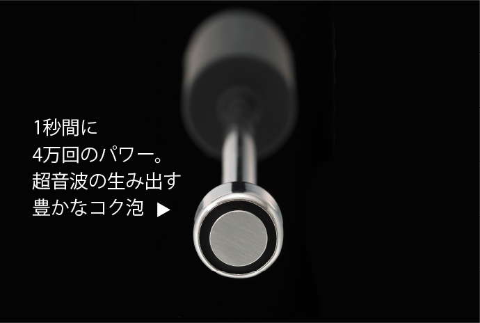 ビールの泡にとっては油と汚れは大敵なのでまずはキレイなグラスの準備から始めます。あとはビールをグラスに注ぎ、「ビアフォーマー」を入れてボタンを押すだけ。4万回/秒の超音波はビールを小さくシェイクしているのと同じ環境を作りだし、ビールの美味しさを閉じ込めるクリーミーな泡を作り出します。また泡にはビールの苦味成分が集まるので、まろやかな仕上がりになります。