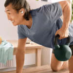 また、イヤホン本体はIPX4の防滴仕様。トレーニング、雨天でのランでも安心。もちろん、激しい運動でも耳から落下しにくいフォルムです。さらに、3サイズのイヤーチップと固定用アーチが付属し、しっかり耳にフィットできエクササイズに集中もできますよ。