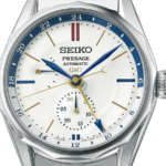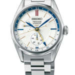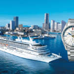 数量限定モデル「プレステージライン オーシャントラベラー飛鳥Ⅱ コラボレーション限定モデル」(27万5000円)は、ダイヤルに、琺瑯職人・横澤満氏監修のもと製作された艶やかな質感の琺瑯を使用。「飛鳥Ⅱ」の真っ白な船体を彷彿とさせるこの白いダイヤルの12時位置には、「飛鳥Ⅱ」が郵船クルーズの保有であることを象徴する赤の二本線「二引き(にびき)」がデザインされています。