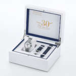 この200本限定のモデルは、スペシャルボックスにネイビーの付け替え用クロコダイルストラップを同梱して、9月24日より発売です。