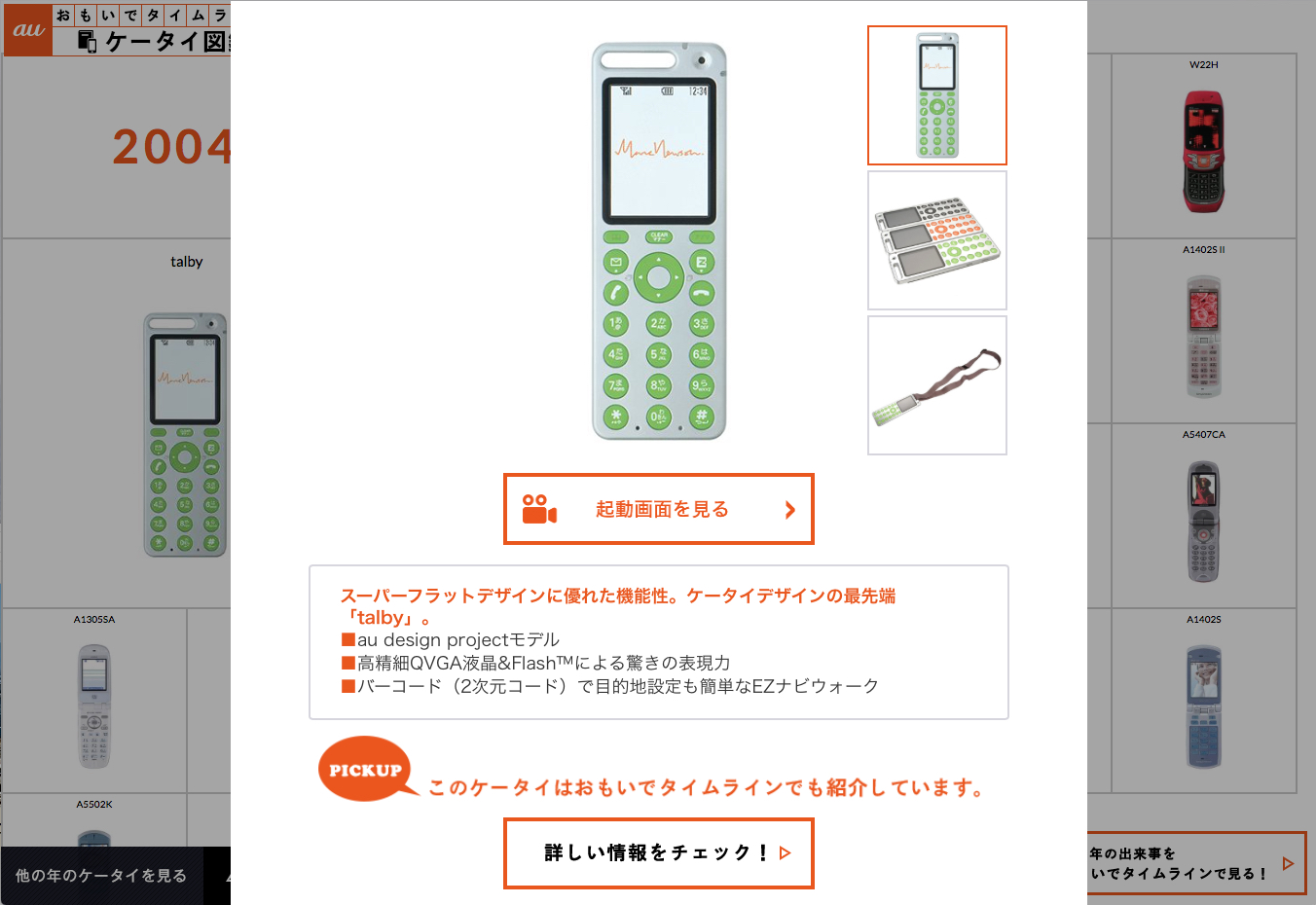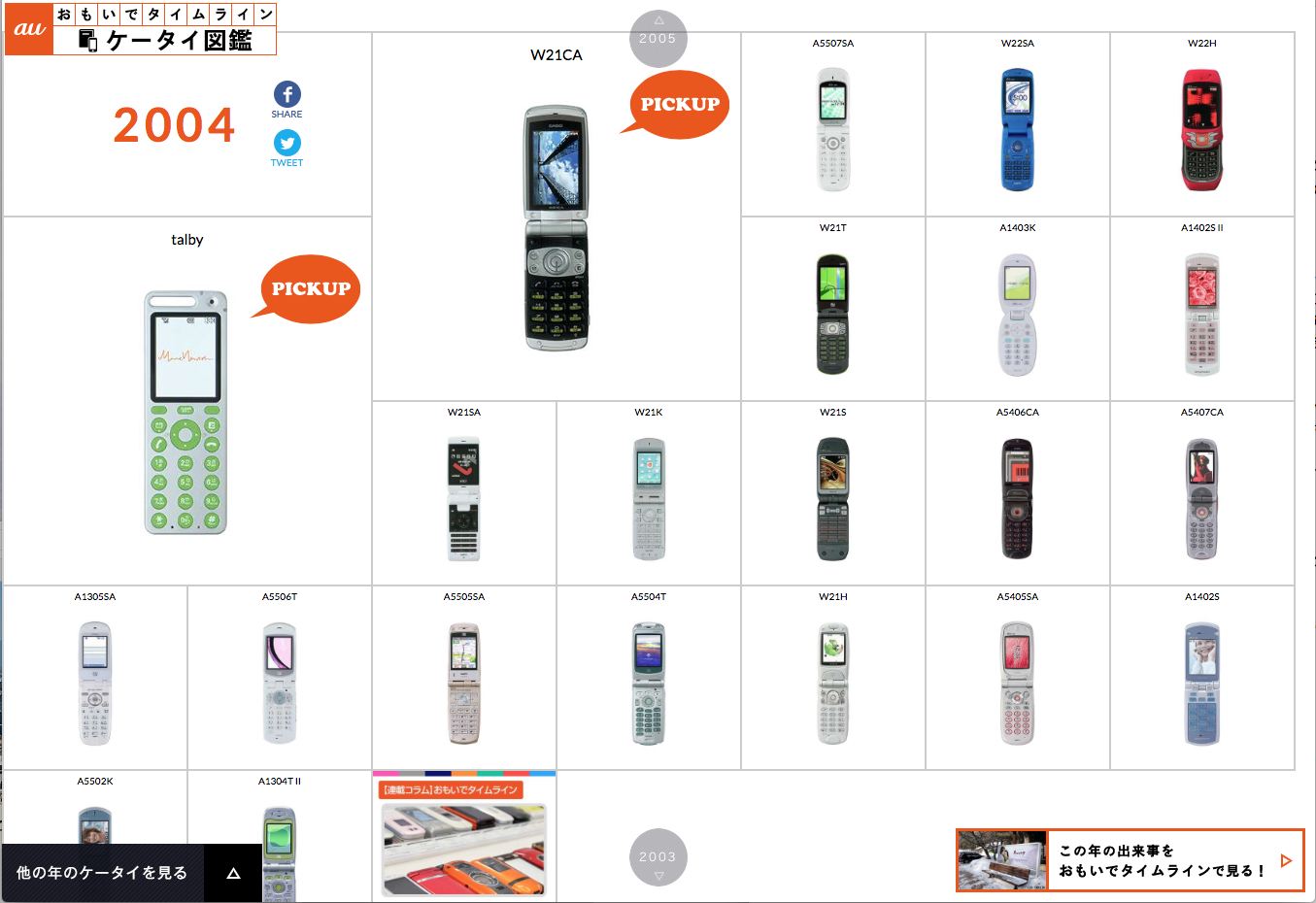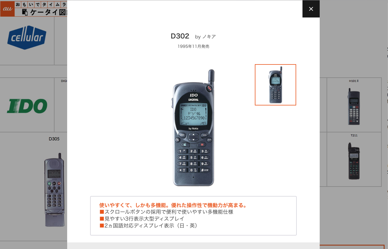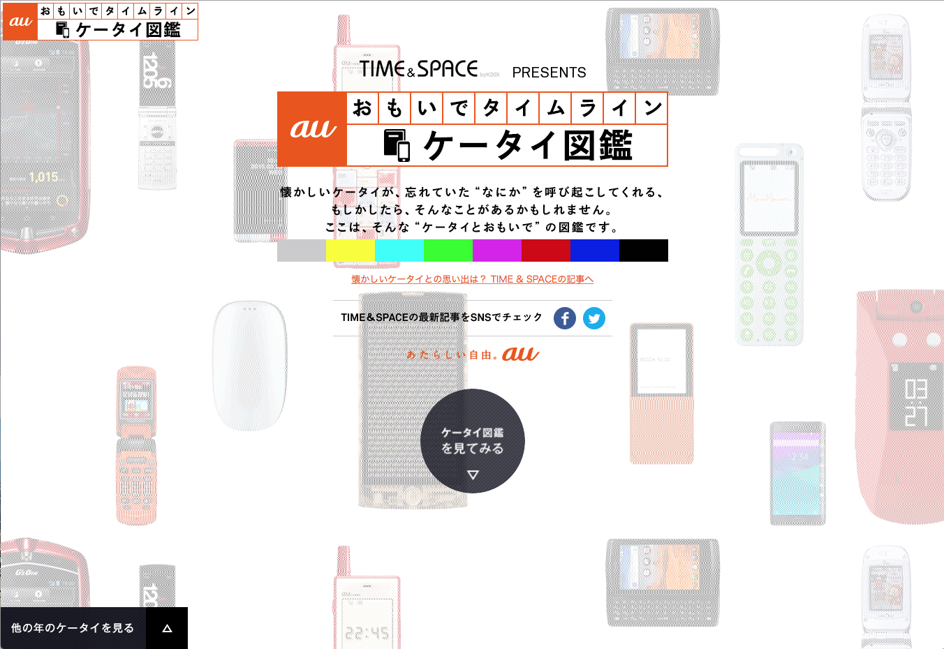 1987年に発売された携帯電話の原型ともいえる「ショルダーフォン」から、2015年に発売されたスマホ・ケータイまで、600以上の機種を掲載。新しいモデルを先に掲載し、画面をスクロールして、ケータイの歴史を振り返れるようになっています。auブランドが誕生する以前の「IDO」、「DDIセルラー」、「ツーカー」のモデルも掲載されているので、自分が初めて使った思い出のケータイや、気になるけど購入を見送った機種なども見つかるはずです。