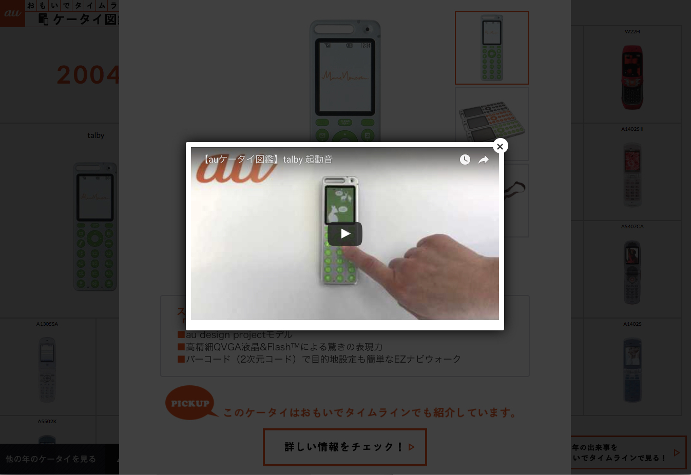 気になる機種をクリックすると、発売当時のカタログに掲載されていたキャッチコピーなどを見ることができ、機種によっては、起動画面を動画で見ることもできます。