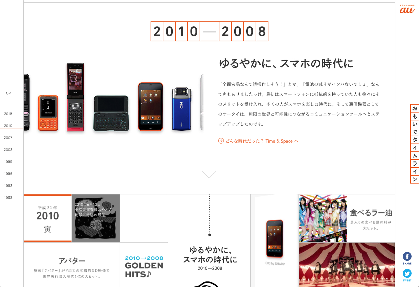 この「おもいでタイムライン」には、日本で初めて携帯電話が登場してから30年の歴史を、ケータイの進化の過程を8つの時代に分けて、それぞれの時代の出来事や音楽、流行語などを振り返れる趣向になっています。