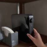 ミラー磨きのガラストッププレートは、同色で印刷された円のみが描かれ、使用後にささっと拭くだけでお手入れ完了とストレスフリー。もちろんキッチンなどに出しっぱなしでも、フォルムとサイズ感で全く気にならないどころか、むしろ置いておきたくなるデザインです。