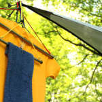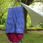 まず、一晩寝て汗を吸ったシュラフを、たたむ前に乾かしたい時。これまでは車の上や地面に広げたりしていたところ、「テレスコピックハンガー」に掛けて吊るせば、日光と自然の風で効率よく乾燥できます。