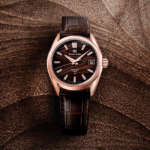 奥行きのあるダークブラウンのダイヤルと、暖かみのある18Kピンクゴールドの組み合わせが、芳醇な風格を感じさせます。ザラツ研磨による鏡面仕上げに繊細な筋目を組み合わせたケースは、18Kゴールドを削り出して造形したインデックス、視認性の高い時分針とともに、ふくよかな輝きを放ちます。