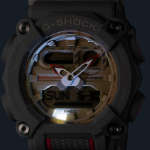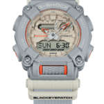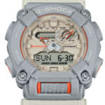 「GA-900BEP-8AJR」では、ライトグレーとオフホワイトを基調に、ワークウェアを彷彿とさせるビビッドなオレンジを差し色として、時針・分針、ベゼルの内側、ボタン、裏蓋まわりなど随所に配置。シンプルでミニマルながら個性的なデザインに仕上げています。また、フロントボタンやサイドボタンほか各所に刻んだすべり止めのチェッカリング(クロスの溝)もデザインのポイントになっています。