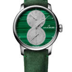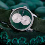 今回の新モデルでは、Louis Erardの代名詞ともいえる「エクセレンスシリーズ レギュレーター」をベースモデルに採用。3つのダイアルと3本の針が、それぞれに時の流れを時・分・秒で刻むレギュレーターはそれだけでも個性的な佇まいですが、今回の特別モデルでは二層になったダイアルのメイン素材として、アベンチュリン(砂金石)とマラカイト(孔雀石)を使用することで、神秘的でラグジュアリーな空気感を纏うドレスウォッチへと生まれ変わっています。