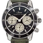 ジン独自の特殊結合方式で固定された両方向回転ベゼルには「103シリーズ」で初となるセラミック製のベゼルインサートがはめ込まれ、卓越した硬度と優れた耐傷性を実現。第二時間帯を表示するための12時間スケールを備え、時分秒針、インデックスとともにアイボリーカラー&夜光塗料の塗布で統一されており、クラシックなイメージを高めています。また、光沢のあるブラックダイヤルには「Sinn」、そしてブランド&時計自身の生産地を示す「FRANKFURT AM MAIN」の文字が配置されています。