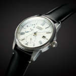 時計ケースはデュラテクトプラチナ加工を施したステンレススチールで、ケースサイズはΦ40.5mm×厚さ14.1mm、風防は無反射コーティングを施したデュアル球面サファイアガラスを採用(10気圧防水搭載)。