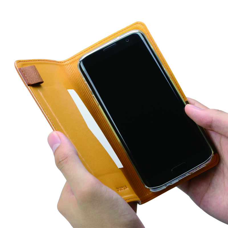 フラップタイプのレザーカバーは特殊な粘着面を持ち、クリアケースを貼りつけても、端末を直接貼り付けて使用してもOK。端末を直接貼り付ける場合には、iPhone 6s Plusなど5.5インチサイズまでの様々な端末に対応している。